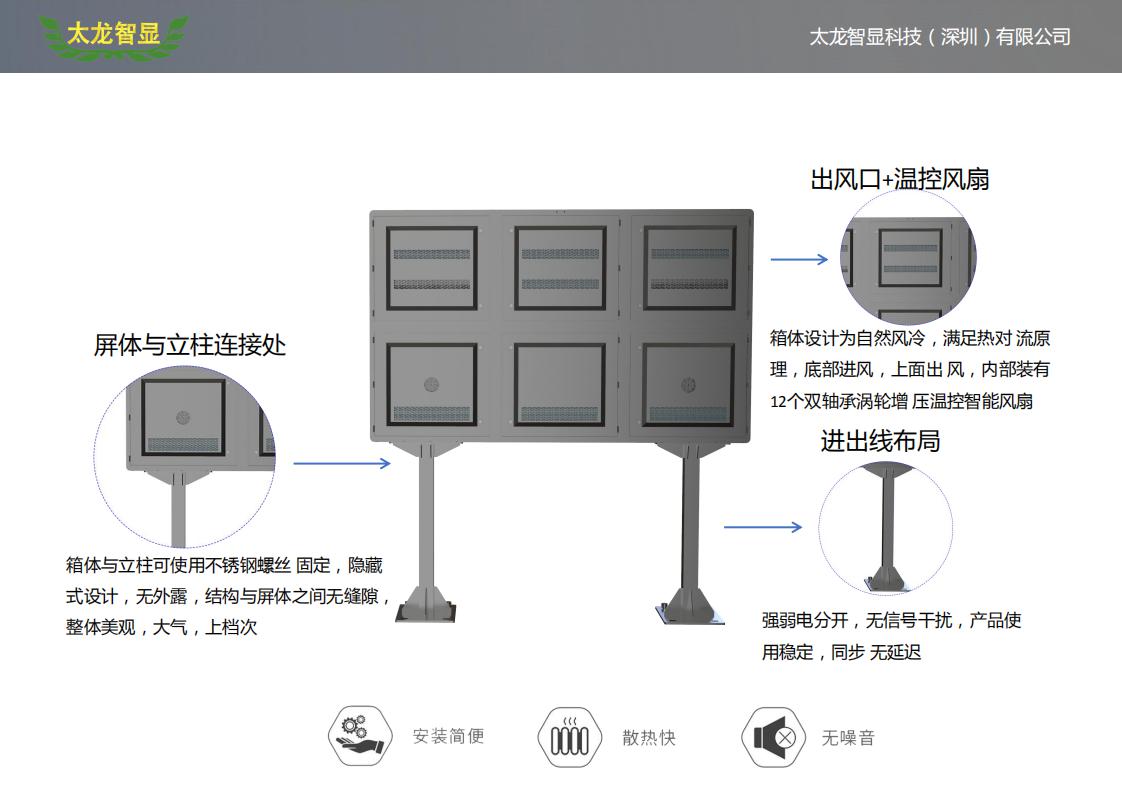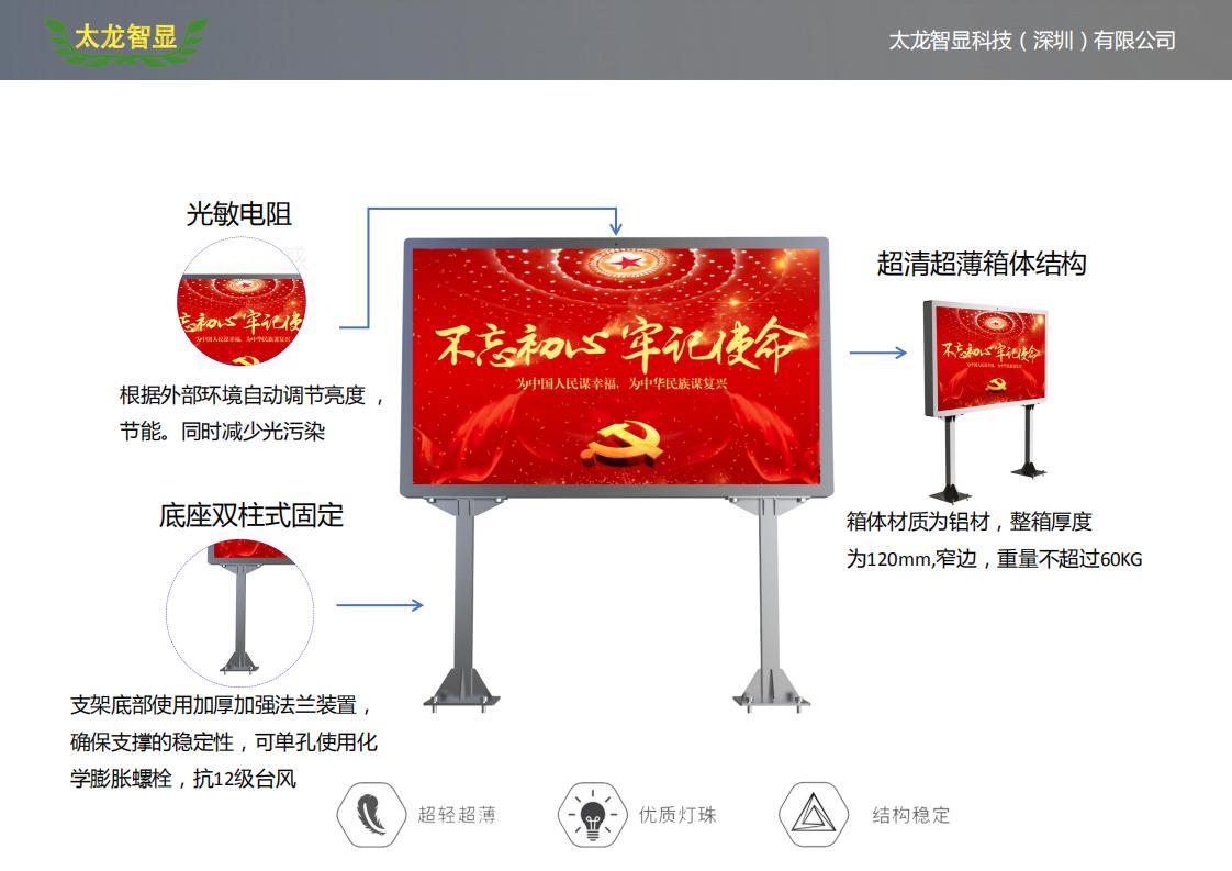 社區(qū)戶外LED廣告機(jī)?-T3.57-2400X1400mm單面LED廣告機(jī),箱體材質(zhì)選用鋁材,箱體材質(zhì)輕薄,窄邊,外觀靚麗輕盈,為更好使用戶外使用環(huán)境,箱體設(shè)計(jì)為自然風(fēng)冷,滿足熱對流原理。此款支架底部使用加厚加強(qiáng)裝置,確保支撐的穩(wěn)定性,單孔使用16*M12化學(xué)膨脹螺栓,能抗12級臺風(fēng);箱體與支架使用304不銹鋼螺絲固定,隱藏式設(shè)計(jì),結(jié)構(gòu)與屏體之間無縫隙,具有更好的防水性。改款LED廣告機(jī)材質(zhì)選用鋁材,存儲為內(nèi)置存儲,防護(hù)級別達(dá)IP65,安裝簡單,支持底部加固,能防12級臺風(fēng),改款戶外LED廣告機(jī)適用于社區(qū)、街道以及個戶外場景。